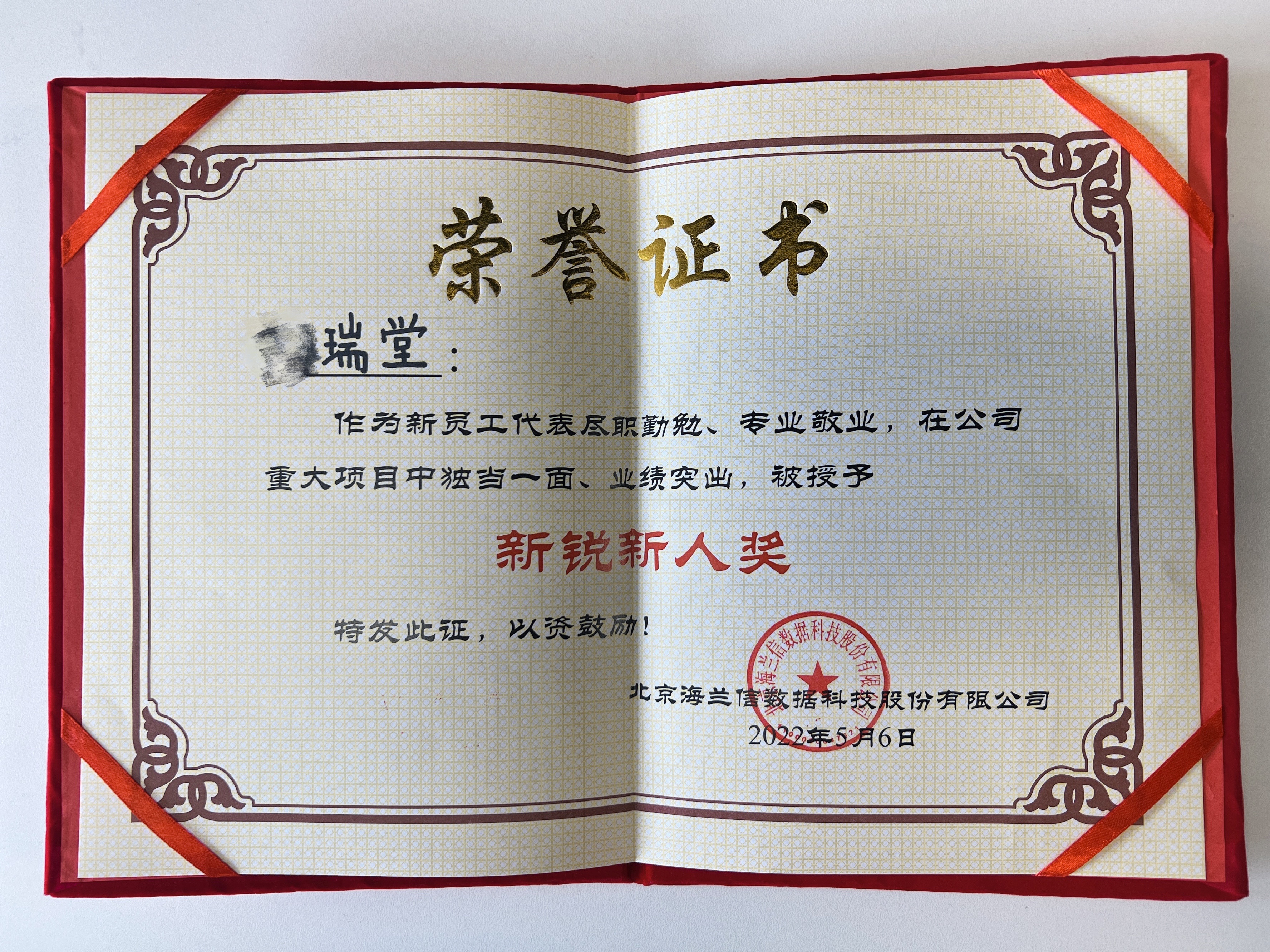 戰(zhàn)略資本中心的瑞堂畢業(yè)于中國人民大學(xué),2021年10月加入海蘭信,在這半年多的時間,通過個人專業(yè)、職業(yè)、敬業(yè)以及積極主動的工作態(tài)度為公司上億級重大項目貢獻價值,榮獲公司頒發(fā)的“新銳新人獎”。