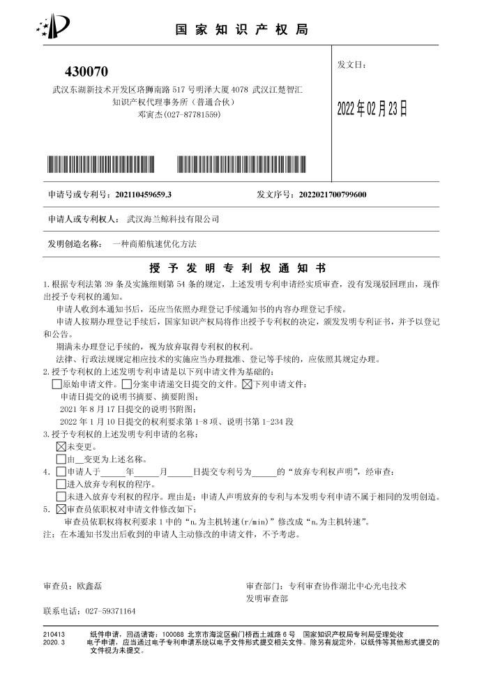 2022年2月23日,經(jīng)過國家知識(shí)產(chǎn)權(quán)局權(quán)威專家評(píng)審委員會(huì)的嚴(yán)格評(píng)審,海蘭信智能船SBU收到發(fā)明專利權(quán)通知書,專利名稱為“一種基于商船的航速優(yōu)化方案”,專利號(hào)為202110459659.3。