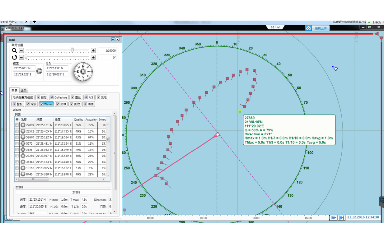 本產(chǎn)品通過雷達原始回波信號對海面波浪進行監(jiān)測,反演附近海域的海浪參數(shù)及海流計算,生成虛擬浮標(biāo)高度變化曲線,海浪數(shù)據(jù)可進行實時記錄并可選擇任意時間點進行回放,顯控終端界面可顯示、查詢、統(tǒng)計歷史海浪參數(shù)數(shù)據(jù)。